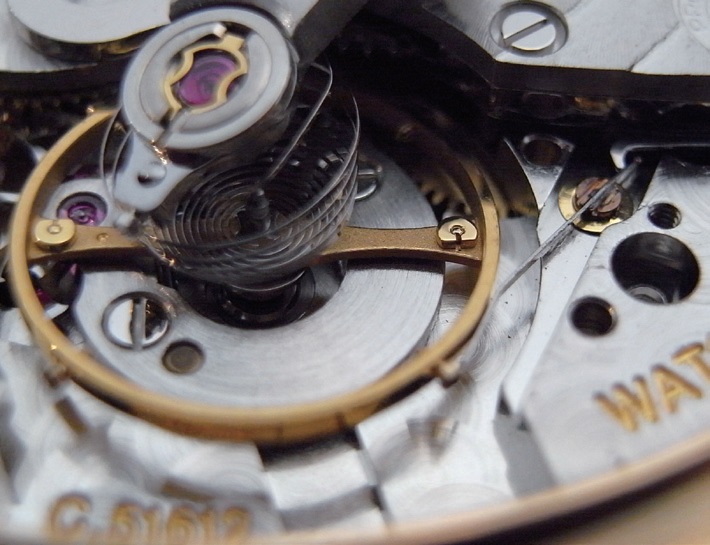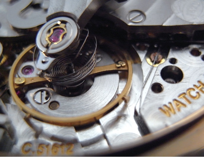 此圖可看到當錶冠未拔出時,擺輪與安置於其側邊的掣停簧片並未接觸,兩者間成平行排列。
