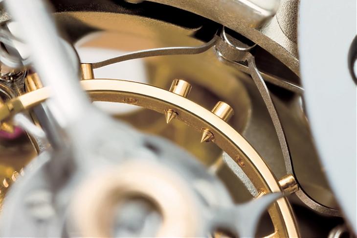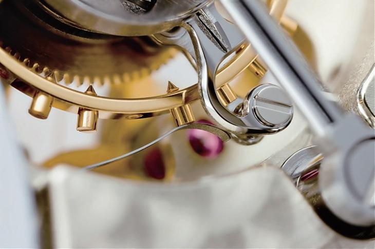 品牌用以暫停擺輪的關鍵在於一個取得專利的V 形掣停彈簧,同樣經由錶冠與槓桿連動來運作。