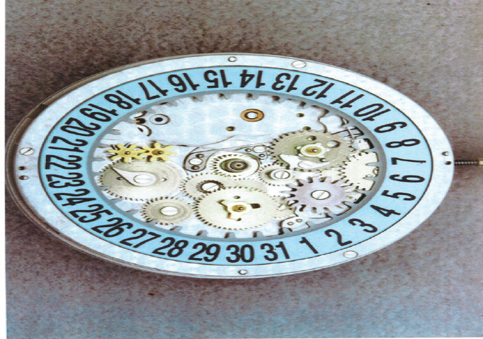 另外時輪亦帶動中間輪1(1 有上下兩層,下層為日期進位撥動裝置,上層為月份進位裝置),再帶動日曆輪2 及年曆機制3 與4,此機制上方有5 個凸點,凸點為小月(即2.4.6.9.11 月),平的圓弧部分為大月。同時日曆輪2 帶動中間輪5,再帶動中間輪6,撥動日期盤7。