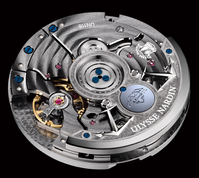 愛彼的「扭轉乾坤」機芯在中層夾板上有大量的珍珠紋,即使遇到螺紋孔洞仍不影響其紋路連貫性。