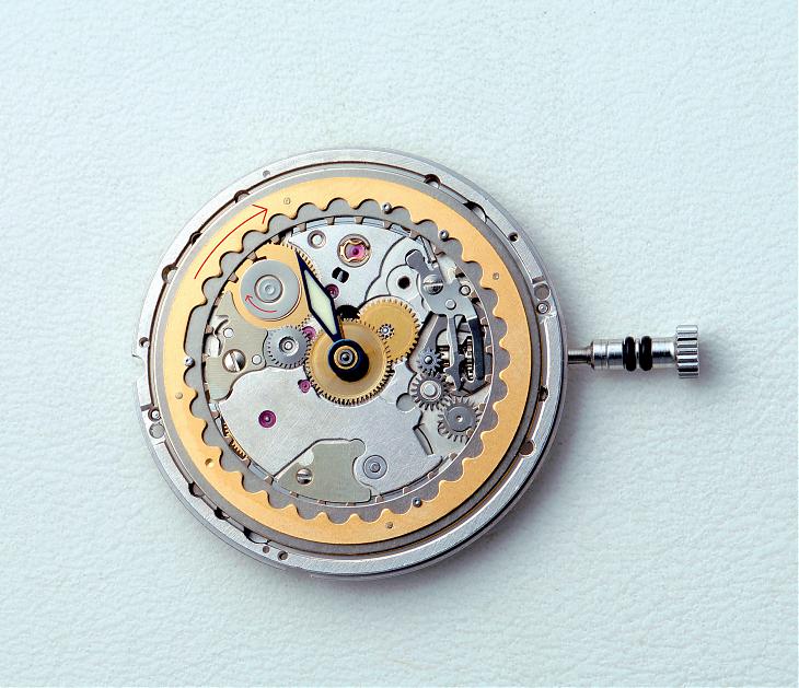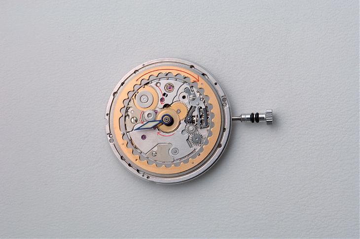 此款示範的機芯其實是3126,不過拿掉計時模組後,與其基礎機芯3120 是一樣的,故藉之說明。3120 的撥日輪有三層結構,中間的是銅質齒輪,上、下則是連動的鋼質零件,內置可積蓄動能的彈簧;在機械還沒進入換日程序的時候,整個撥日輪同步旋轉,當撥日勾已經接觸到日曆環內齒時,齒輪下方基板上的一個L 型勾會卡住下層組件,與之連動的上層組件也會隨之停止動作,此時銅質齒輪仍繼續旋轉,內置的彈簧則開始累積能量,到了適當時候,下層組件會頂開L 型勾,讓上下層組件瞬間跟上銅質齒輪,撥日勾因此帶動日曆環前進一格,完成換日動作。