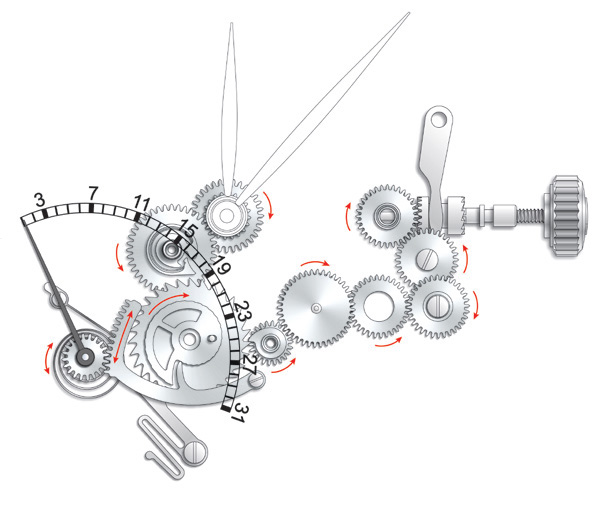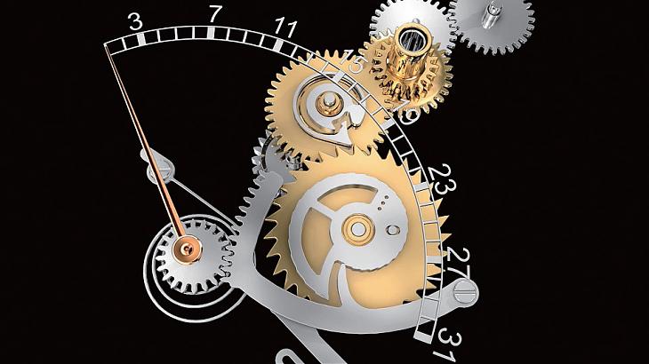 前述的是採用視窗型日曆的機制,而在指針型日曆裝置中,輪系排列也是相同道理,差別在於最後撥動的不是日曆環,而是日曆指針。礙於篇幅,我們只選逆跳式的指針型日曆來加以說明。逆跳的關鍵在於逆跳輪與狀似F 形的日曆槓桿,逆跳輪為同步動作的上下兩層,下層與撥日輪接觸,上層的蝸形輪每31 天轉一圈,透過其特殊的外形設計,可以逐日推高日曆槓桿,並在達到頂點(31 日)後,讓日曆槓桿瞬間落回最低點(1 日),達到瞬跳換日的效果。