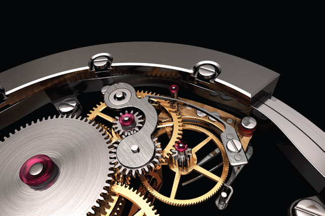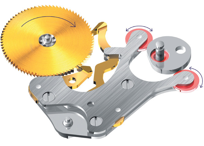 2010 年發表的最新款機芯,其環形自動盤與上鍊輪系之間不以輪齒相接,而改以勾爪式的結構傳動。