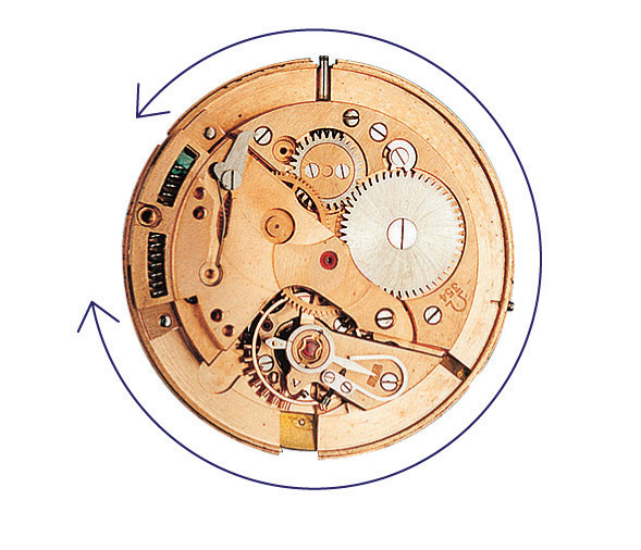 兩個鉑金長形方塊取代了一般自動盤的作用,隨著手部姿勢可以在軌道上左右移動,藉此進行上鍊。