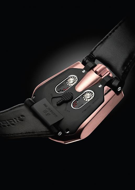 從錶背可看到空氣渦輪制動器及三段開關,可設定日常生活、激烈運動與極限運動的不同上鍊狀態。