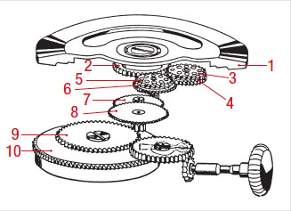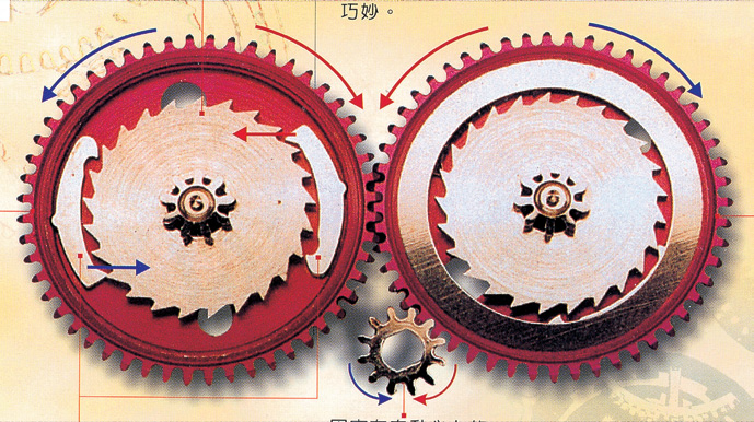 1 到10 為能量從自動盤傳遞到發條盒的過程,關鍵在於3、4 同軸與5、6 同軸的兩組轉向輪。