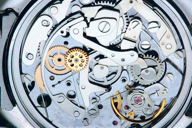 棘輪結構指的是能控制齒輪只做單向作用的設計,這樣才能讓自動盤一邊空轉,而另一邊可以上鍊。先以單向上鍊的ETA 7750 為例,其轉向輪B 由上而下可以分為上層齒輪、棘輪、下層齒輪、軸心小齒輪,後面三者連動,可以與上層齒輪作反方向旋轉,因此只有自動盤(已卸除,軸心在A 的位置)往上鍊方向旋轉時,才會傳動到減速輪C。若在雙向上鍊的情況,則像ETA 2451 一樣,再加一個輔助轉向輪即可。