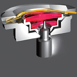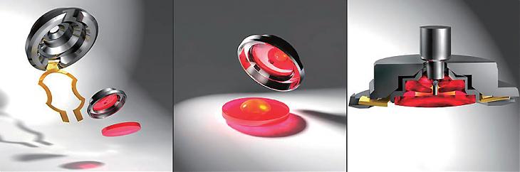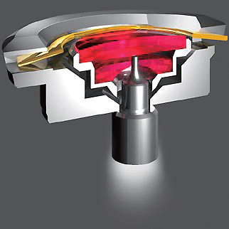 因此在1933 年,瑞士的Universal Escapement 公司推出Incabloc 因加百祿避震器,這是目前最為常見的避震器;它延續降落傘式避震裝置的主要原理,以上方的簧片緩衝整個避震器基座的位移力量,進而保護擺輪軸心的完整,而這一個錐形的避震器基座,則是與降落傘式避震裝置的最大不同之處。