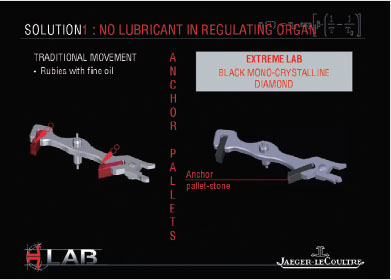 在2007 年, 積家推出了革命性的MasterCompressor Extreme LAB 概念陀飛輪腕錶,並表示機芯可長時間運作,卻不需上油;其中擒縱輪也是矽材質製作,但是擒縱叉上的紅寶石則改由水晶黑鑽取代,這是如天然鑽石般堅硬的人工材質,可確保與矽擒縱輪長期摩擦後,仍不需潤滑保養。