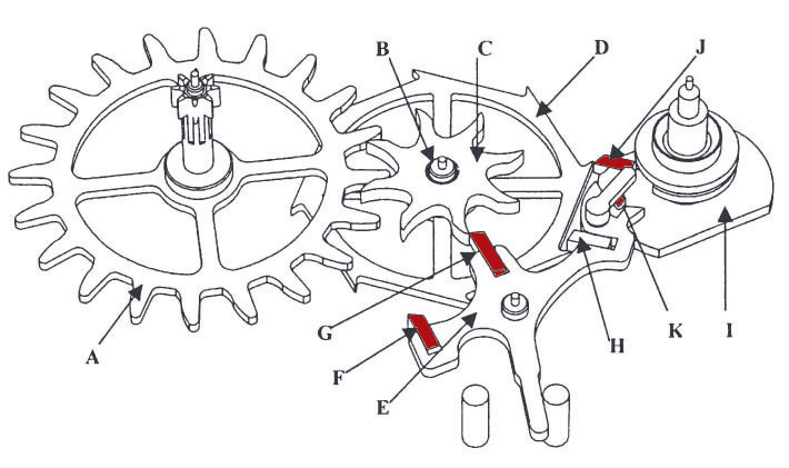 (A)中間傳動輪、(B)同軸擒縱輪軸、(C)上層擒縱小齒輪、(D)擒縱輪、(E)擒縱叉、(F)(G)(H)擒縱叉紅寶石、(I)衝擊盤、(J)衝擊盤紅寶石、(K)月形紅寶石。