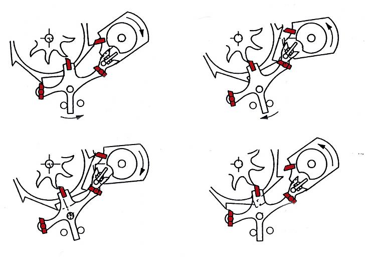 在擺輪順時針回彈時,月形寶石(B)開始撥動擒縱叉,使擒縱叉向上移動,同時間防護拴也開始準備進入衝擊盤。