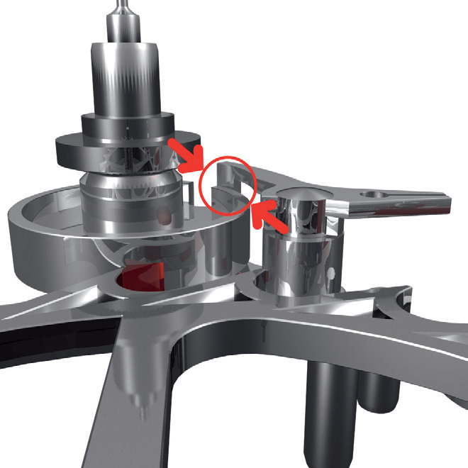 芝柏新款擒縱裝置所需的空間較大,幾乎佔了三分之一的空間。而每一個軸心上下都放置了一組避震器,這也是在瑞士機芯上,少見的設計。