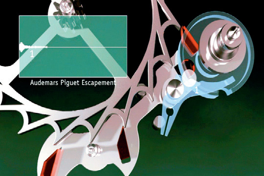 AP 擒縱裝置同樣是以擒縱輪來傳遞能量給擺輪,在完整的擺輪運轉中(也就是來回轉動各一次),擒縱輪只需要衝擊擺輪一次(OMEGA 的同軸擒縱裝置需要擒縱叉提供另一次的力量),因此擒縱叉與衝擊盤上的月形寶石僅擔任鎖定與解除鎖定的功能。但是AP 擒縱裝置的擒縱輪僅有單層設計,也僅有兩個擒縱叉寶石,零件更為簡潔,擒縱系統也無須點油潤滑。