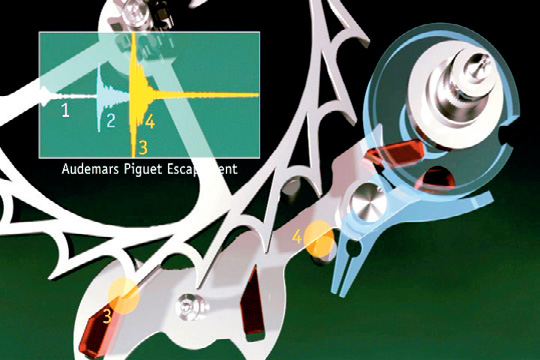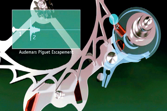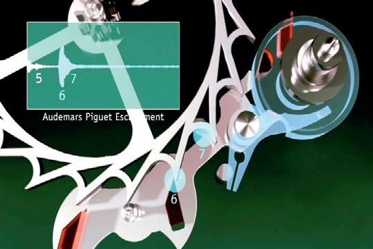 在愛彼原廠的實驗中,發現瑞士槓桿擒縱裝置本身銷耗了65% 的能量,而AP 擒縱裝置僅消耗48% 的能量,比傳統的擒縱裝置能量提高了50%。此外為了減低震動造成的問題,錶廠製錶師特別在擒縱叉加裝防護栓,深入擺輪衝擊盤內,能夠阻止系統在意外撞擊下脫落,提高抗震力。