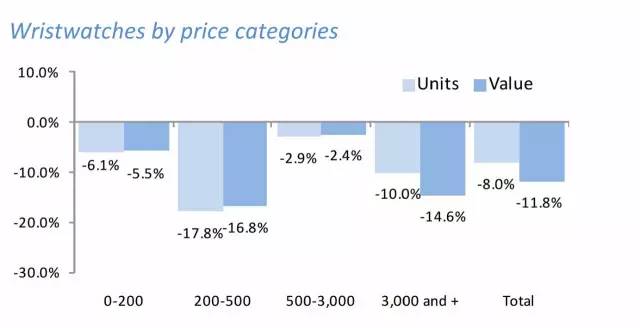 自2015年Apple Watch推出後,大家都在留意它的銷售量走向,智能腕錶對瑞士鐘錶的重創,已不是新聞。而且,從腕錶價格面分析此次的降幅,明顯發現是奢華腕錶與智能腕錶同價的腕錶為主,讓人不得不產生聯想。價格介於200-500瑞士法郎的腕錶銷售量和出口量的下滑數字如溜滑梯般,銷售下滑直達16.8%,出口量下滑17.8%,從市場直接的反應中,減少該價位腕錶出口進行停損的做法,間接也看見智能手錶對於機械錶市場的打擊。