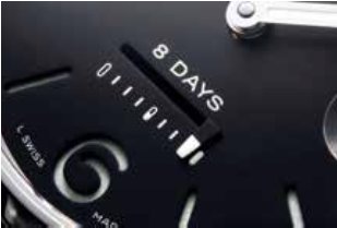 P. 2002機芯的錶款的一大特徵便是水平的動力儲存顯示,指示針上有蓄光塗料,夜光效果相當好。機芯有十日的動力,但為了避免使用者到了最後兩天扭力不足時才上鍊,儲能顯示僅標示到第八天。
