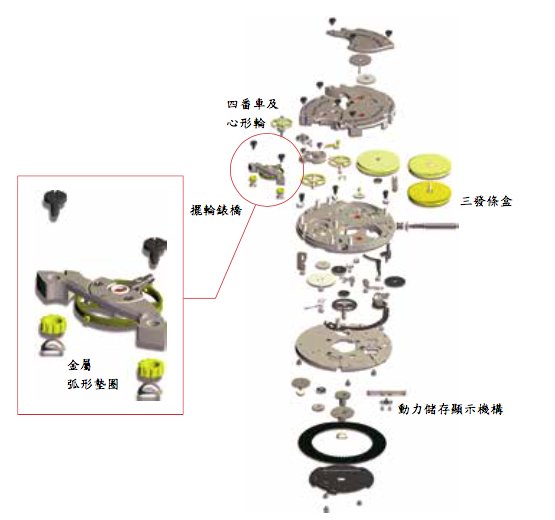 P. 2002採用三發條盒,具備秒針歸零功能和水平儲能顯示。擺輪錶橋和基版間的金屬弧形墊圈,能微調錶橋的高低和左右水平,可以用來調整擺輪和擒縱器間的相對位置。