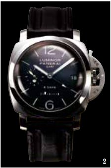 P . 2002最大的特色當屬八天的長儲存動 力。機芯的長動力是靠三個發條盒所提供的,由兩個串連的銀色發條盒並連一個金色發條盒;除了提供更長的驅動時間,複數發條盒也有穩定扭力的作用,所以這幾年各大錶廠的新製機芯就算沒有長動力的需求,也多會選擇多發條盒的動力機構。其實P. 2002的儲存動力高達十天,之所以號稱八日鍊、儲能顯示也只有八天,是為了讓使用者在還剩二天動力時便為發條上鍊,避開最後二 天扭力不足時對走時的影響;2007年推出的P.2003是P. 2002的自動版,由於自動機芯只要有在佩戴就幾乎不會把動力耗盡,所以 P. 顯示。機芯採用雙幅螺絲擺輪,以四顆方帽螺絲微調擺輪的擺速。擺輪以橫跨式錶橋固定,一般咸信橫跨式的擺輪錶橋比單臂式的來得穩定;而P. 2002的擺輪錶橋和基版間有一對金屬的弧形墊圈,讓螺絲將錶橋鎖在基版上時能微調錶橋的高低和左右水平,可以用來調整擺輪和擒縱器間的相對位置。勞力士的Cal. 3135機芯也有同樣的設計,從勞力士和PANERAI的淵源來看可以說是其來有 自。錶冠抽出第一段時能不影響分針地獨立 調校時針,抽到底時便是一般的調校,並且會連動第二地時間針;一般調校時除了停秒,平心而論,P. 2002還有一些改進的空間,像是日期是滑動式的而不是瞬跳式的(雖然也有人以為瞬跳對輪系的負擔較大)、而且不能快調,夾板的裝飾也太陽春(其實編者個人還滿喜歡這種現代感的風格的)、而且多是機械打磨而非手工,但不能否認 的,P. 2002仍然是一枚很有個性的機芯,尤其是它沛納海味十足,對死忠的來說這恐怕才是最重要的吧。