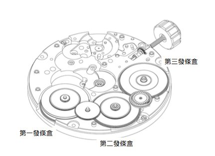 直接連結輪系的發條盒為第一發條盒,以此類推第二、第三發條盒;第一發條的彈力比第二和第三發條弱,所以輪系在把第一發條盒的動力耗盡前便會連動第二發條。另外除了第一發條是手上鍊發條,第二、第三都是自動上鍊發 條,在滿鍊後便會空轉,能防止上鍊上過頭絞斷發條。