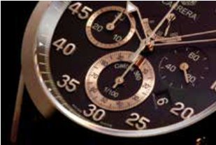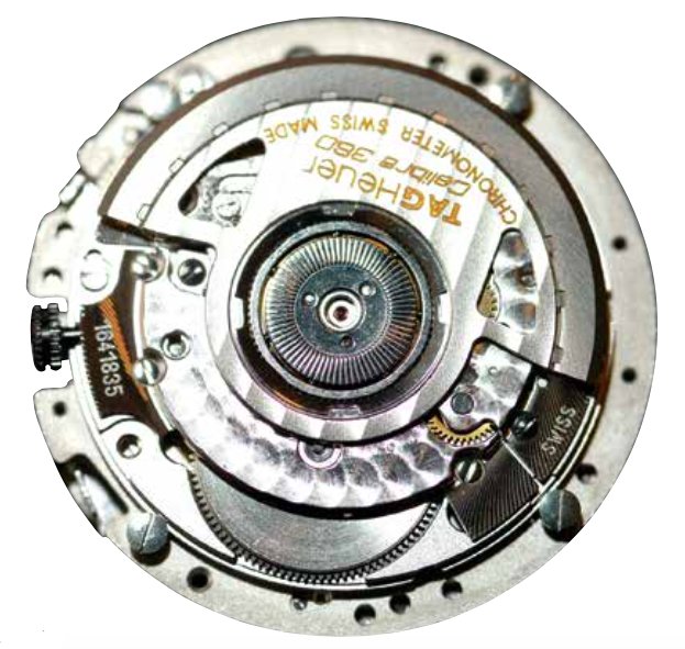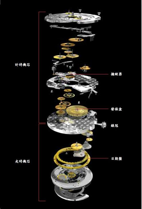 一般計時碼錶是以離合計時和走時輪系來完成計時動作,也就是整個機構只有一組擒縱器,所以計時和走時的震頻自然一樣;Cal. 360 如果採用一般計時碼錶的結構,就意味著走時輪系的震頻就得有 360,000vph, 而一般擒縱器的材質和結構,在以這等高頻 率常時的耗損下,用不著多久就得回廠了。 Cal. 360 的做法是釜底抽薪,索性以一枚獨 立的 360,000vph 機芯來負責計時動作,而走 時則是以另一枚普通的28,800 vph機芯來負責,這樣 360,000 vph機芯只有在操作計時功 能時才需要作動,大大地減少了擒縱器耗損 的機會,讓 1/100 秒計時腕錶成為可能。Cal. 360 的走時機芯採用了以 ETA 2892 為基礎的的厚度,而且 TAG HEUER還將它調校到擁有 C.O.S.C. 天文台認證的水準;為了要負荷 360,000 vph 的高速,Cal. 360 的計時機芯採用 了直徑是一般三分之一的、只有 5.8mm的小型擺輪和較短的游絲,機芯作動時擒縱器的動作幾乎無法以肉眼確認,而錶盤上計時針的走動也像SEIKO的Spring Drive一樣滑順。 為了不讓複雜功能的作動影響到一般走時、或是功能需要的動力較大,機械機芯的複雜 功能有時會以獨立的發條盒來提供動力,像很多鬧鈴錶、貴朵的小自鳴、或是積家2007年的Duomètre à Chronographe都是。Cal. 360的計時功能是由一枚完全獨立的機芯來驅動 的,動力系統自然也是獨立的,然而二枚機 芯的上鍊卻是由同一個錶冠來操作:順時針是為計時機芯上鍊,反之則是走時;這樣的 安排讓計時上鍊比較方便,其實也是考慮到 計時機芯是手上鍊,而走時機芯是自動上鍊、比較不用頻繁的上鍊的緣故。透明底蓋下看得到的是走時機芯(看不到計時機芯的 小型擒縱器編者以為還滿可惜的),也就是從錶面來看,計時機芯是在上層,走時在下層,錶面的日期盤則是隔著計時機芯來加以 連動,而這項機構也是Cal. 360的眾多專利之一。平心而論,Cal. 360並不是一枚頂複雜的機芯,而且還使用了現成模組,然而它那種挑戰的姿態卻仍值得肯定,2006 年的日內瓦鐘錶獎將最佳運動錶頒給 Cal. 360,相信也是出自這樣的認同。