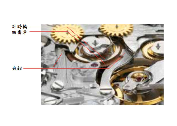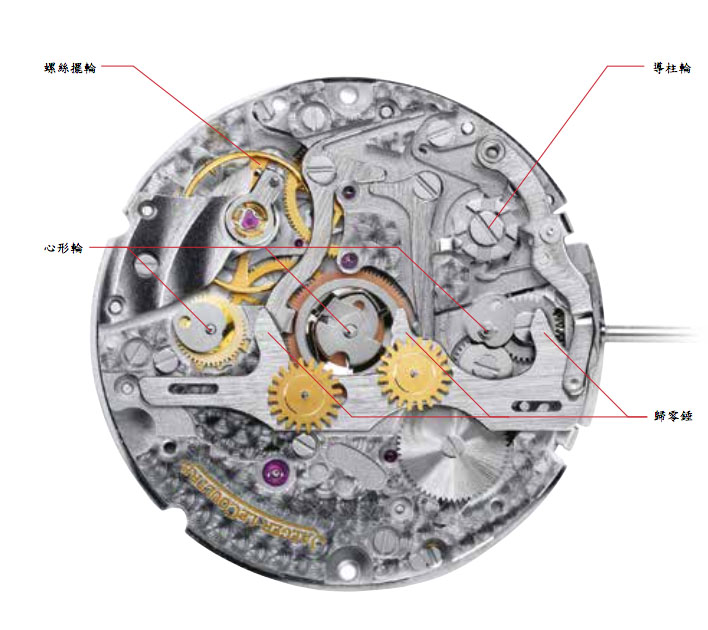 這幾年新發表的計時碼錶機芯不少,關鍵技術的革新卻不多──像F. P. JOURNE的Centigraphe或是TAG HEUER的Cal. 360自然另當別論;其中垂直離合要算是比較重要的一 項。計時碼錶的原理在離合計時和走時輪 系,目前常見的離合機構,如ETA的7750,多是以平移的方式讓計時輪系連上走時輪系,也就是所謂的水平離合;水平離合的缺點在於,計時輪從側面撞進作動中的走時輪,十分容易發生二個齒輪的輪齒囓合不準的情形,導致計時動作偷跑或延遲,久了還會造成輪齒的磨損。垂直離合則是把計時和走時輪系間的相對位置由水平改成垂直,計時輪平常懸空在四番車的正上方,當計時碼錶啟動時,會有一對夾鉗從左右插入計時輪和四番車間的空隙,讓計時輪連動上四番車,完成離合動作。目前市場上採用垂直離合的,除了積家的Cal. 751,還有勞力士2000年版Daytona的Cal. 4130、百達翡麗5960P的Cal. CH28-520 IRMQA24H、蕭邦Chrono One的Cal. L. U. C 10CF、以及精工Spring Drive的Cal. 5R86等等,幾乎都是一時之選,也許之後垂直離合也會像導柱輪一 樣,成為高級計時機芯的指標規格之一也說 不定。垂直離合幾乎解決了水平離合所有的問題,唯一的缺點是整個機構需要較大的空間,為了要控制整枚機芯的尺寸,Cal. 751勢必得在別的地方瘦身。一般三眼計時碼錶歸零機構的三個歸零錘,多由一枚擁有二個歸零錘的夾板和一個獨立的歸零錘所構成(當 然還有若干槓桿和回復弓),而且二組機構分別位在基板的二側;Cal. 751將整個歸零機構都放在基板的同一側,並只用一枚擁有 三個歸零錘的夾板來完成整個機制,所佔的空間既少,分件又簡單,不但讓歸零的動作更有效率,還減少了故障的機會(另外前面的勞力士4130、蕭邦L. U. C 10CF、還有精工2008年發表的8R28也都採用了類似的機構)。 除此之外,陶瓷滾珠軸承自動盤、雙發條盒、螺絲擺輪和導柱輪等漂亮的規格自然也不在話下,讓Cal. 751優秀的設計能建立在紮實的基礎之上。