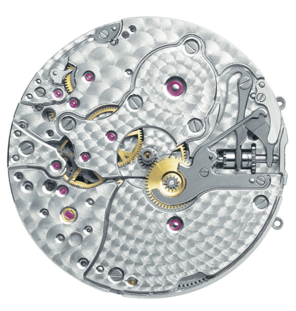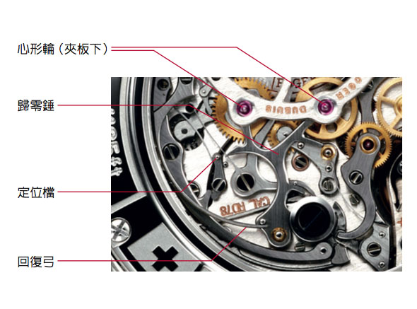 RD78是以RD77為基礎加裝計時模組,所 以要談RD78還是得從RD77講起。RD77最大的特色當屬它的微型自動盤,照豪爵總裁Carlos Dias的說法,採用微型自動盤是為了不讓自動盤遮住夾板和零件,Dias 對他家機芯全部擁有日內瓦印記的自負從此可見一 斑;微型自動盤的半徑小,力臂短,上鍊效率低,為了要增加力矩,自動盤採用了大比 重的鉑金材質,而且盤身極厚,儘量讓它的上鍊更有效率。擒縱器採用光擺輪、橫跨式擺輪錶橋,以快慢針搭配偏心螺絲來微調; 豪爵機芯多採用鵝頸式微調,偏心螺絲算是比較少見的,而且它快慢針的設計相當獨特,以雙頭箭頭指示快慢,這樣的設計增加了加工的難度,卻讓機芯饒有古風。RD78的計時模組是直接疊在RD77上頭,其中計時 秒針輪和計時分針輪的夾板設計成像個鏤空的蓋子蓋在自動盤上,是RD78的一大特徵。 計時機制採用導柱輪連動水平離合,算是現 在一般高級計時機芯普遍的作法;不過RD78的導柱輪特地以一顆超大型的藍鋼螺絲給蓋了起來,倒是和一般還在夾板上挖洞要讓導柱輪露出來反其道而行,雖然偌大的一顆藍 鋼螺絲本身就滿醒目的。在操作RD78時讓編者印象最深刻的是,計時碼錶在啟動/停止時按把的手感固然犀利,然而在歸零時則 更是異常地敏銳,歸零按把不用按到底,只要稍加按壓計時針便會瞬跳歸零。一般歸零機構多是以歸零按把推動槓桿,槓桿經過導柱輪連動到歸零錘,再由歸零錘抵著計時針的心形輪把他們切回原位。RD78的歸零錘平常是以回復弓,抵著緊貼在心形輪上,啟 動時一組槓桿會繃緊回復弓將歸零錘拉到定位以定位檔固定住,歸零時則是鬆開定位檔,讓歸零錘彈回去將心形輪敲回原位。所以RD78的歸零和一般的有截然不同的手感, 操作時甚至還聽得到歸零錘敲擊心形輪的聲音。其實這樣的設計,不論是回復弓還是歸零錘敲擊心形輪的動作對機芯都是額外的負擔,勢必得在安定性上多下工夫,豪爵為了實現高級的質感不惜大費周章,其中自有一股擇善固執的霸氣。