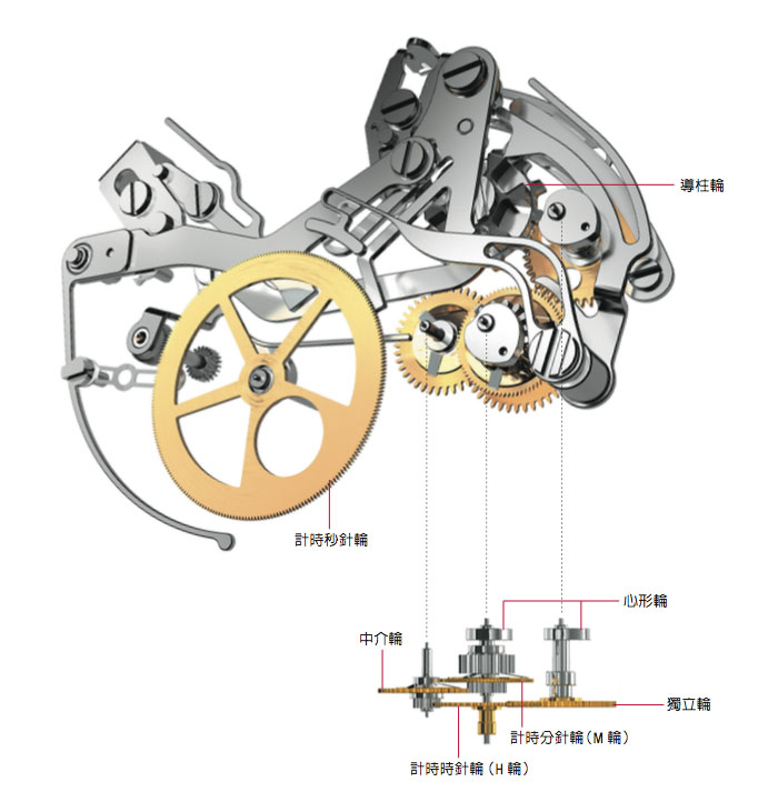 Cal. 89360 的歸零機構在這幾年愈來愈簡化的趨勢下相對顯得複雜。計時時針輪(以下稱 H 輪)和計時分針輪(以下稱 M 輪)雖然同軸, 但歸零卻是各自獨立作動;其中M輪的心形 輪仍和M輪同軸,但H輪的心形輪卻是裝置在一枚獨立於這組輪系之外、僅和H輪連動的獨立輪上。歸零時,H輪和M輪間的中介輪會先分離二輪,再以歸零錘分別敲擊二枚心形輪完成歸零動作。