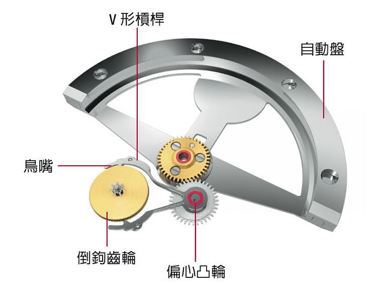 新式的系統將一對鳥嘴都改成了 "V" 形的槓桿,這對 槓桿的一端和原來的鳥嘴一樣,另一端則從倒鉤改成向前送,這樣它在「來」的時候鳥嘴同樣會勾動齒輪,「回」的時候另一端也會向前送進一格輪齒,來回一個行程能讓齒輪轉動二格,整個行程裡沒有多餘的動作。事實上,與其從傳統的啄木鳥上鍊系統來理解, 新式的系統其實更接近精工的Magic Lever,只是改成上下重疊的一對。
