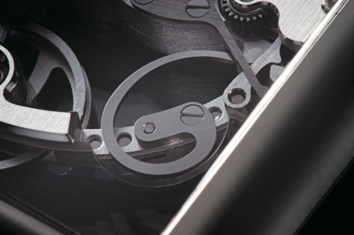 9616稱之為鏤空機芯,實則跟傳統的鏤空不太相同,夾板的部分固然是極力簡化到最基本的必要結構,然而它卻將基板的部份換成了藍寶石水晶。由於基板透明,因此整枚機芯的構圖就由夾板的編排來決定,961X系列專為鏤空所設,輪系的編制原本就儘量精簡,無甚多餘的結構,而在這枚9616它讓整個輪系從撥針系統、雙發條盒、二三四番車到擒縱調速機構剛好繞了一圈,整套夾板的主架構也就是一個環形,形成了整枚機芯工整的主視覺。