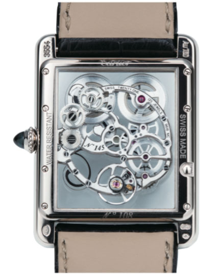 過去像這種「輪系轉用」的改制方式,最擅長的要數跟同集團的伯爵,不過伯爵的改裝多半是基於性能、複雜功能的需求,卡地亞在這裡則完全是設計取向,雖然同樣是一手製錶、一手做珠寶的兩大名門,但在這一部分還是展現出個性上的差異。這枚9616也是從這個系統下誕生的作品,一方面它沒有刻意要排列出什麼具象的圖案,輪系的編排上相對單純,但是採用了藍寶石水晶的基板這點卻讓它在結構強度和加工上產生出更多問題要解決,因此要論技術密度的話也絕對不輸同家族的其他成員。