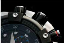 由於錶款屬於水上運動用錶,所以按把具備旋入式的按把鎖,比較特別的是按把鎖往外旋到底乃是將按把鎖住,往內旋到紅圈露出才能操作按把,和一般的設計正好相反。