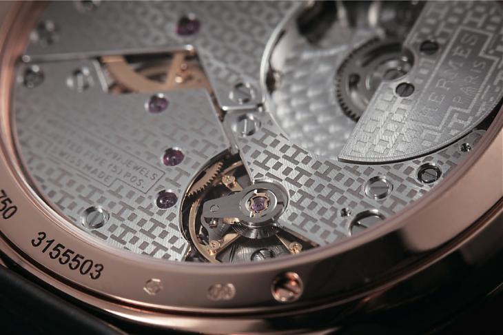 話雖如此H1950卻不算一枚全新的機芯。眾所週知愛馬仕的自製機芯是由他們持股的Vaucher機芯廠所生產的,而Vaucher的產品除了愛馬仕之外最大的客戶就是帕瑪強尼。帕瑪強尼經典的微型自動盤機芯PF701在Vaucher廠裡的番號是VMF5400,同一個番號的模組經過不同的修改、裝飾後分別賦予不同的型號、出給不同的品牌,愛馬仕的H1950雖然在板路上高度地個性化,然而從輪系還有規格數字上來看仍然不難發現它其實是出自VMF5400家族。雖然同樣是VMF5400為基礎,然而隨著後續的處理不同成品機芯的售價可以差到一倍,近年來Vaucher就是利用這樣的區隔化還有生產方式的改良,逐漸將他們產品從高價位打入中價位市場,而愛馬仕這幾年得以大幅地以Vaucher製的H1837、1912取代掉原本的ETA系統,託的也正是Vaucher這套新策略之福,讓他們得以在成本增加有限的前提下完成自製化。