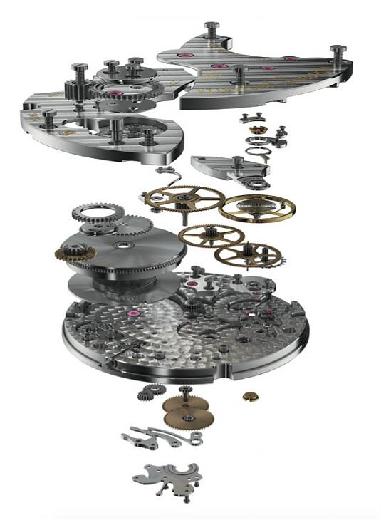 4400的動力系統比一般的多走了幾個齒輪,從小捲車到大捲車之間還夾著數枚中介輪,以這枚機芯整體純粹的構成而言顯得有點不尋常。如果不考慮加裝其他功能的話,省掉這幾枚中介輪或許可以多裝一個發條盒,不然將發條盒往右移,左半邊騰出更大的空間後也可以採用更大的擺輪,甚或改成橫跨式擺輪錶橋,這些都是可能的選項,不過事實上江詩丹頓在這裡卻選擇了中介輪系這樣的做法,而關於這點筆者個人也有一些推論。