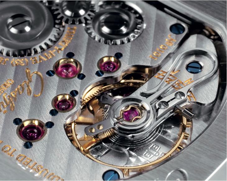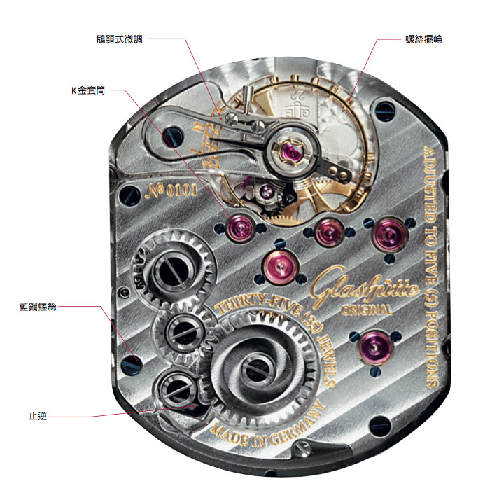 賞玩德國機芯最大的樂趣自然還是機芯的裝飾。GO最常見的基礎機芯Cal. 39和Cal. 100,老實說裝飾得並不算很漂亮,K金套筒和藍鋼螺絲都不多,尤其它們的鵝頸式微調作得相當功能性,少了鵝頸式微調應有的美感;同樣是基礎機芯,Cal. 22的裝飾就很精彩,除了各式打磨、倒角拋光,每個外露的寶石都有K金套筒, 藍鋼螺絲也用得很大方,而且鵝頸式微調作得古典、修長,鵝首也很秀氣,深得德國機芯的三昧。