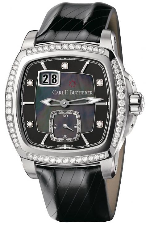 不鏽鋼材質 / CFB A1003自動上鍊機芯 / 時、分、小秒、大日期顯示 / 錶圈鑲鑽56 顆、共1.1 克拉 / 藍寶石水晶鏡面、透明底蓋 / 防水50米 / 錶徑38.54×39.25mm。