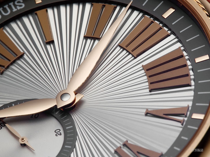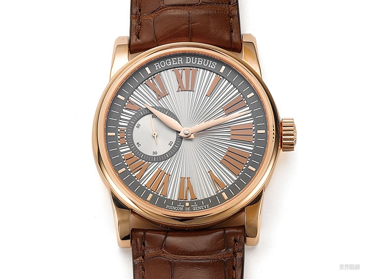 這樣看來小三針款在裝飾上的技術含量的確是低於雙陀飛輪款的,但其實純就成品來看,這款的作工仍然具備了一流水準:機刻本身用上了深淺兩種不同的稜線,再加上它的光澤不同於一般機刻,光線一打呈現出來的立體效果極其獨特,除此之外面盤上還有另一個層次的小秒盤,而這個子面盤上又有自己的同心圓紋、另行分件的立體刻度圈,整個面盤的豐富程度絕對是等閒的外裝加工所無法比擬的,凡此都無愧ROGER DUBUIS之名。