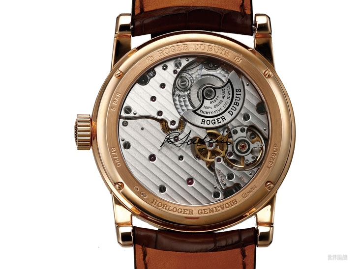 搭載RD現役重要的基礎機芯RD 620,微型自動盤是他們家機芯的特色之一。機芯具備日內瓦印記,不過錶殼的部分則沒有。透明底蓋上印有Roger Dubuis的簽名,點出系列本身的致敬意味。
