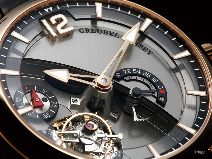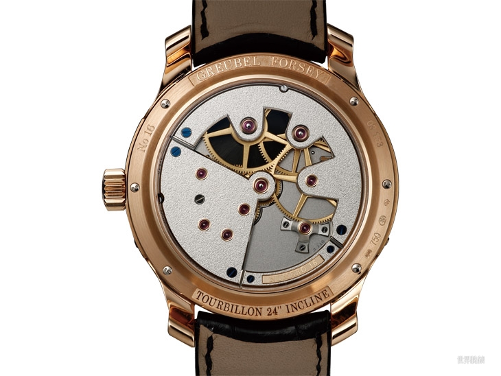 24秒陀飛輪是GREUBEL FORSEY的第三項發明,具體的技術是一顆傾斜25度、迴轉週期只有24秒的高速陀飛輪。GF的成名作30度雙陀飛輪,這款跟它相比不但傾斜角度、迴轉速度都不同(30度雙陀飛輪的內層1分鐘一圈,外層4分鐘一圈),更根本的差異應該是在於一個是單一陀飛輪、一個是單體雙軸陀飛輪。傾斜式的陀飛輪(或者說是傾斜式的擒縱器)可以說是GF對製錶的核心價值,離心力、質量慣性原本就是高速陀飛輪最主要的問題,而這一點在傾斜的陀飛輪上更加重要,因此在加快了陀飛輪的迴轉週期之後,傾斜角度勢必也得做出對應的調整,而這個25度就是他們計算出來能夠徹底發揮傾斜陀飛輪的優點、同時還能確保裝置在離心力下的穩定性的最佳解答。