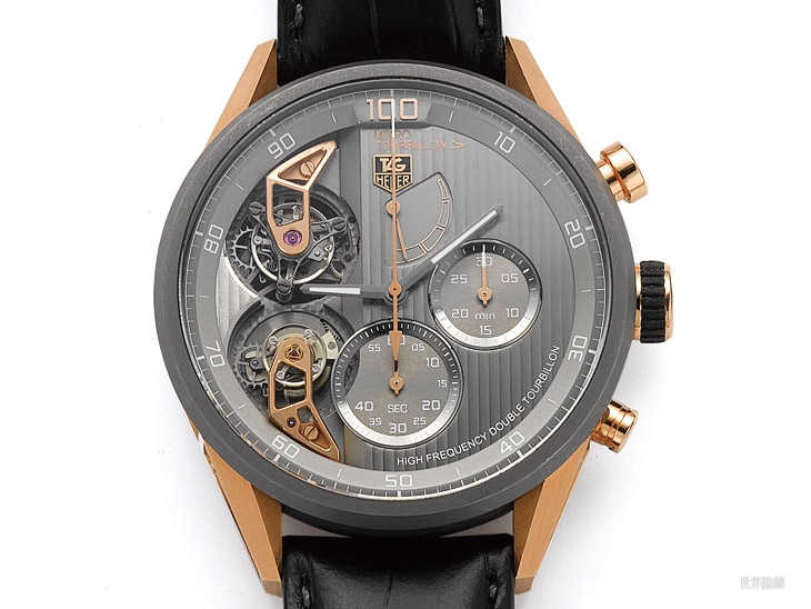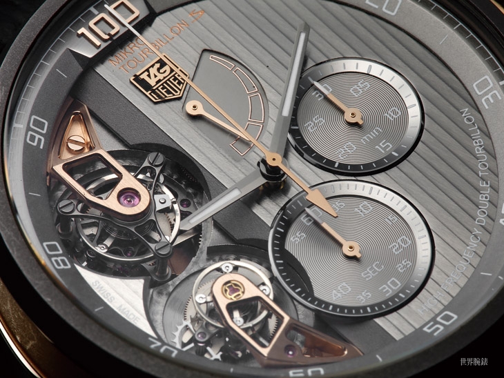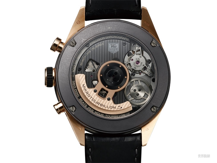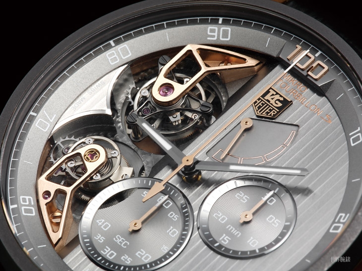 MikrotourbillonS是TAG HEUER豪雅的「計時/走時分離」系統中迄今最複雜的作品之一。從2005年的Calibre 360開始算起,豪雅對計時走時分離這項機制的研發將近十年,時至今日他們對這套系統的基本結構已經可以說是相當純熟了;當然,早期的Calebre 360還是直接在ETA 2892上加裝計時模組,實驗性質還重,這整套技術的一體化、成熟化應該要從2011年以後的Mikrograph 100開始算起,但無論如何到了MikrotourbillonS推出的2012年時雙輪系各自獨立的結構對豪雅來說已經很有基礎了,因此再往上加碼似乎也成了接下去不得不這麼做的一個發展方向,要嘛就再拉高震頻,要嘛就增加機芯的複雜程度,而後者就催生了這款雙陀飛輪的計時碼錶。