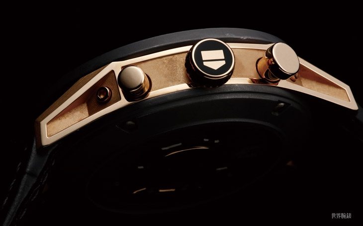 其實突出式的錶殼最早是出現在四陀飛輪的原型錶上,不過四陀飛輪實際產品化要等到2008年,因此反而是24秒陀飛輪率先採用。錶側同樣鑲有銘版,上面刻的是GF的製錶理念。