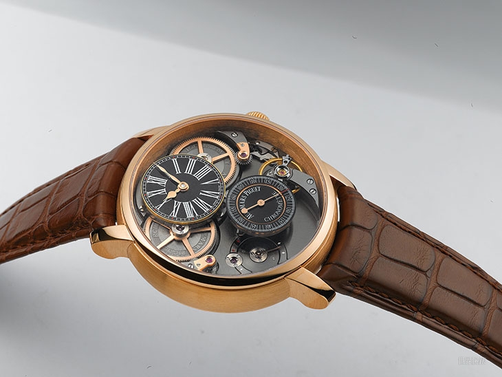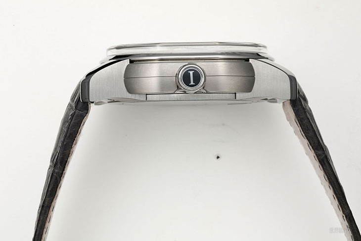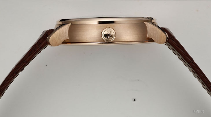這款還有一個賣點就是報時功能的啟動方式,它不用傳統的滑桿,取而代之地是將左下方的錶耳當成了滑桿,操作時只要將它往外扳動即可啟動三問報時。這項設計意味著這支錶耳已經不具備固定錶帶的作用了,下方的錶帶完全由對向的錶耳單獨固定,而要達成這個設計概念,操作的連動結構本身和隨之而來的防水問題都需要有嶄新的規劃,或許有人在美學上還是偏愛傳統的滑桿,不過從技術面來看這項機構在工程上的發明還是相當值得一看的。