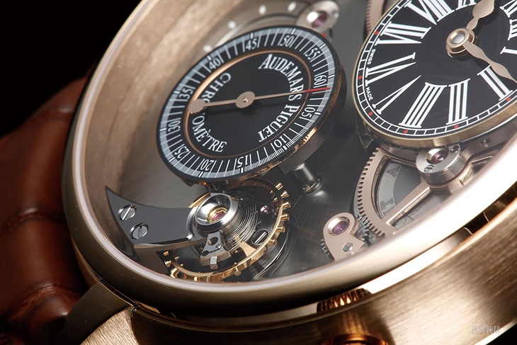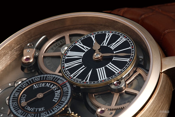 這款算是歷來對愛彼擒縱修改最多的一款,在這款之外的愛彼擒縱款式震頻都在21,600vph,然而這款卻一舉提升到43,200vph,也就是每秒12次震動,在它初出的2009年當時一般市售型號當中只有SEIKO的8L88可以跟它相比;而為了適應這麼高的震頻,這款也換裝了愛彼擒縱款式歷來最小尺寸的擺輪,微調裝置也從砝碼改成螺絲。針對獨家擒縱再加以高震頻化是AP對它在精度表現上的一個期許,事實上在同年(2009)年底他們就把它送去參加那一年重新舉辦的國際天文台競賽,雖然結果並沒有奪冠,但這仍然證明了它複雜的機構並非一味炫技的花拳繡腿,錶款名字中的Chronometer當之無愧。這款玫瑰金款是2012年推出的改款,錶殼之外面盤和外露的基板也都走深色路線,比起白K金版多了一種性感。