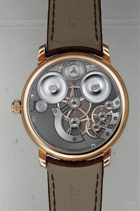 除此之外擒縱部本身的規格也相當豪華,輪系傳遞過來的動力在送進擒縱部之前會先經過恆定動力的裝置,利用擒縱叉式的結構將輪系動力定時、定量地輸往擒縱部,另外擺輪的游絲用的也是立體的柱狀游絲,除了擒縱器之外連調速機構都是天文台規格的。