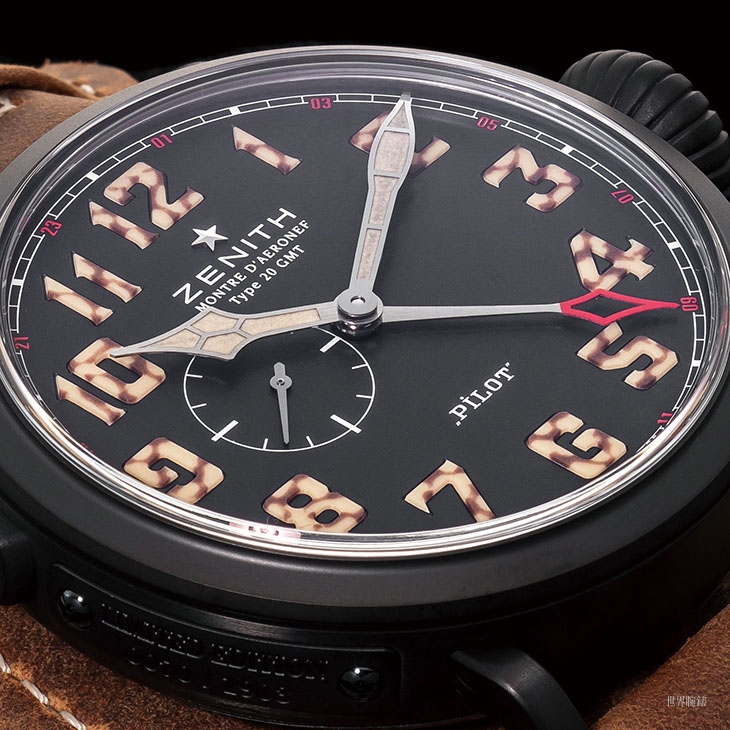 Pilot Montre d'Aéronef Type 20 GMT 1903面盤主要以ZENITH 1930年代所出產的Type 20飛行錶為靈感(而Type 20飛行錶與品牌在20世紀初替Louis Blériot等人製作的古董錶又有相承脈絡),從時標字樣、指針形狀等部分即可發覺原作與復刻新版的高度相似感,不過原作本設於6點方向的小秒盤因為復刻版裝載現代機芯並擴充功能後有了微微變化——小秒盤移至9點方向,並多出中央的第二地時間指針,而2014年新版復刻為了詮釋出更到位的舊日情懷,在塗覆時標與指針上的夜光物料上迭有變化,ZENITH先替前述兩處零件覆上一層Old Radium仿古塗料,接著再於其上注入Superluminova超級夜光物料,除了在昏暗處的發光效果同樣清晰,在光線充足環境下指針與時標則是會呈現出貌似褪色泛黃的觀感,油然而生的風霜感塑造錶款吸引人親近的特質。