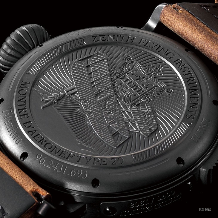2014年ZENITH推出的這只Pilot Montre d'Aéronef Type 20 GMT 1903,沿襲品牌自2012年以降飛行員系列的設計主張,錶款錶徑高達48mm,並採電鍍黑色DLC鈦金屬材質打造外殼,原則上與2013年款的飛行員系列兩地時間腕錶「紅男爵」特別版大致相當,不過Pilot Montre d'Aéronef Type 20 GMT 1903還是有其推陳出新的細節呈現,例如ZENITH此次進一步回首人類飛行史的源頭,向航空先驅萊特兄弟致敬,為了突顯錶款的紀念意義,ZENITH特地在錶款的實底蓋上鐫刻一幅萊特兄弟在Kitty Hawk小鎮沙灘試飛成功的圖樣,且錶款也一改先前系列常用牛皮錶帶的形制,換上經磨砂處理的雙層可拆式杏色麂皮錶帶,不僅更貼近早期飛行錶的樣貌,也讓佩戴者享受自由轉換不同模式的戴錶感受。