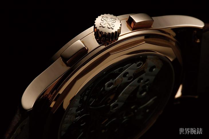 ▲按把採用方形設計,這點從5070開始就一直如此;由於歷代130當中有方形按把也有圓形按把,也無所謂哪種比較古典。因為是手上鍊,所以錶冠維持了一定的尺寸方便上鍊。