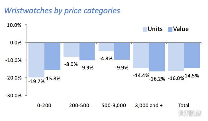 而在價格區間方面,價格500~3000瑞郎的手錶降幅緩和,出口額同比下降9.9%;價格在200~500瑞郎的手錶相比6月也出現好轉,出口額同比下降幅度與500~3000瑞郎同樣為9.9%;價格高於3000瑞郎的區間帶則同比下降了16.2%;價格低於200瑞郎的手錶亦持續惡化,出口額同比降幅為15.8%。