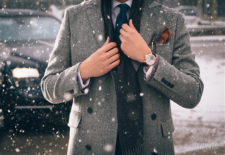 MONTBLANC 4810 ExoTourbillon Slim 超薄外置陀飛輪,波浪紋路的銀白面盤,搭配金色羅馬數字時標,展現輕巧纖薄的優雅,外置陀飛輪讓人一窺機芯的奧祕,宛如一位學識豐厚的紳士,再舉手投足間隱隱顯露內在的涵養。黑白交織的斜紋花呢雙排扣大衣,經典的花紋,溫暖、些微粗糙的天然手感,搭配玫瑰金錶殼與黑色皮革錶帶,宛如穿越時空的紳士;黑色錶帶與大衣上的黑色衣釦、及黑色圍巾,在隆冬中展現莊重與大器;腕錶銀白色面盤,簡約優雅的設計,外置陀飛輪,一窺機芯律動之美,成為品味與智慧的象徵。