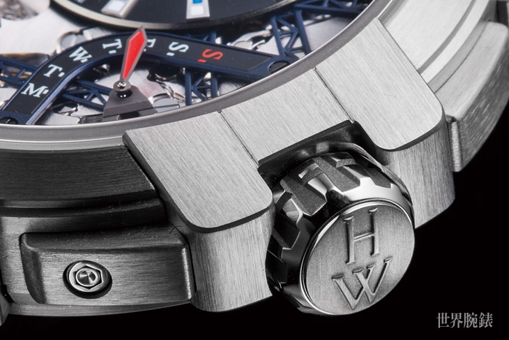 Project Z10所搭載的HW3305機芯透過錶盤的鏤空結構也可從錶面正面觀賞其螺旋狀太陽紋飾。除了備有偏心時、分針外,逆跳秒針、逆跳星期與日期則分據於錶盤下半部。位於6點位置的日期窗置於鏤空支架的相交點上,並以紅色箭頭標示;而4點與8點位置的120º扇形刻度圈,則採用了Project Z系列獨樹一幟的標誌性逆跳設計,打造成4點的逆跳星期及8點的30秒逆跳秒鐘,當指示刻度到達終點後,指針會瞬間自動跳回起始位置,重新開始新的顯示。雖然逆跳星期僅於周日轉換至周一時方會跳轉,然而30秒逆跳秒鐘則分鐘均會上演兩次逆跳動作,並可透過其中欣賞其引導秒針的扇形輪運作,加以採用突出的紅色打造這兩枚逆跳指針,賦予Project Z10動感之餘,也豐富閱時樂趣。