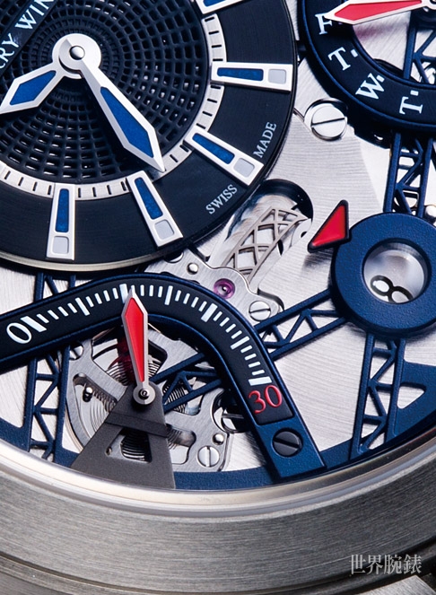 早在第一代的Project Z1,即採用了由Ronald Winston取得專利的航空業專用鋯金屬合金材質製作錶殼,自此成為Project Z系列的優良血統。錶徑42.2mm、整體錶殼厚度10.62mm,光從數字上看也許感覺Project Z10相形碩大厚重,然而得益於其錶殼完全由鋯合金(Zalium™)材質打造,鋯合金不僅比鈦金屬更為輕盈且堅固,同時擁有極佳的抗氧化防腐蝕特性,確保腕錶持久耐用,並具備非凡的美學特質且防過敏的特性,加以人體工學設計,提升配戴舒適性。與Project Z9一樣採用鏤空的錶盤結構,HARRY WINSTON把Project Z10的時分顯示盤從錶盤中軸上移至12點位置,配備內圈細小的黑色鏤空格紋及黑色緞面處理小時圈。鏤空架構設計靈感源自鋼鐵時代初期的宏偉建築巨作——位於紐約的曼哈頓大橋(Manhattan Bridge),參考自橋身的建築線條轉變成錶盤上的鏤空紋路,縱橫相交,極具建築美感。一片銀色的基礎上,錶盤的框架以湛藍色電化鋁材質打造,經細緻雕鏤後,展現金屬的獨特美感,配以時分盤上的藍色鍍銠時標及指針,與呈現亮灰色的鋯合金錶殼,以及黑色橡膠、藍色鱷魚皮雙重材質錶帶形成鮮明的色彩對比,呈現機械現代美感。
